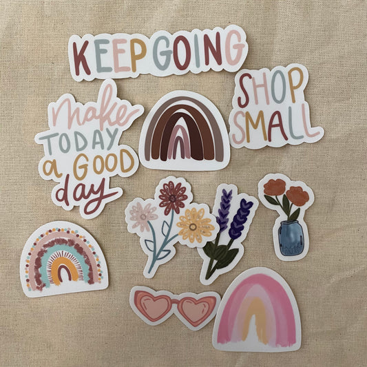 Motivational Sticker Pack - Colorful Dotted Watercolor Rainbow + Keep Going + Make Today a Good Day + Pink, Red, Yellow Flower Bunch