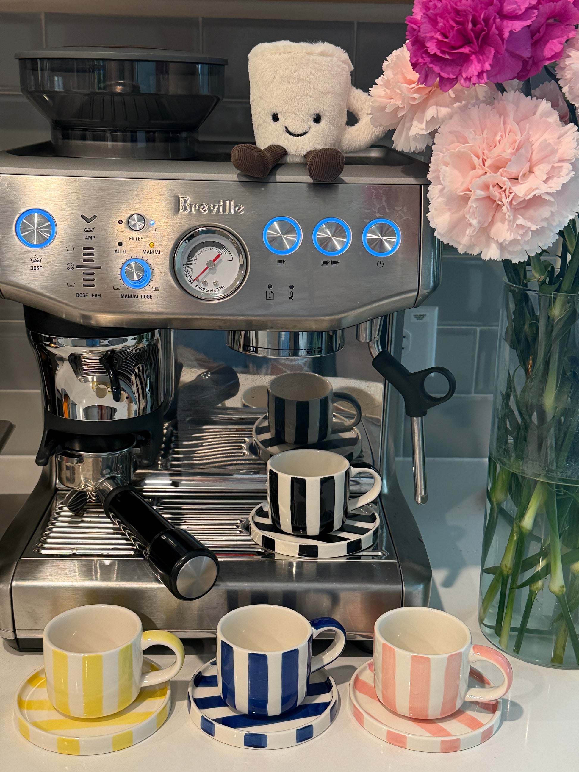 The item includes 2 sets, each consisting of a cup with a saucer (4 pieces). Every stripe and glaze was applied by hand in Germany