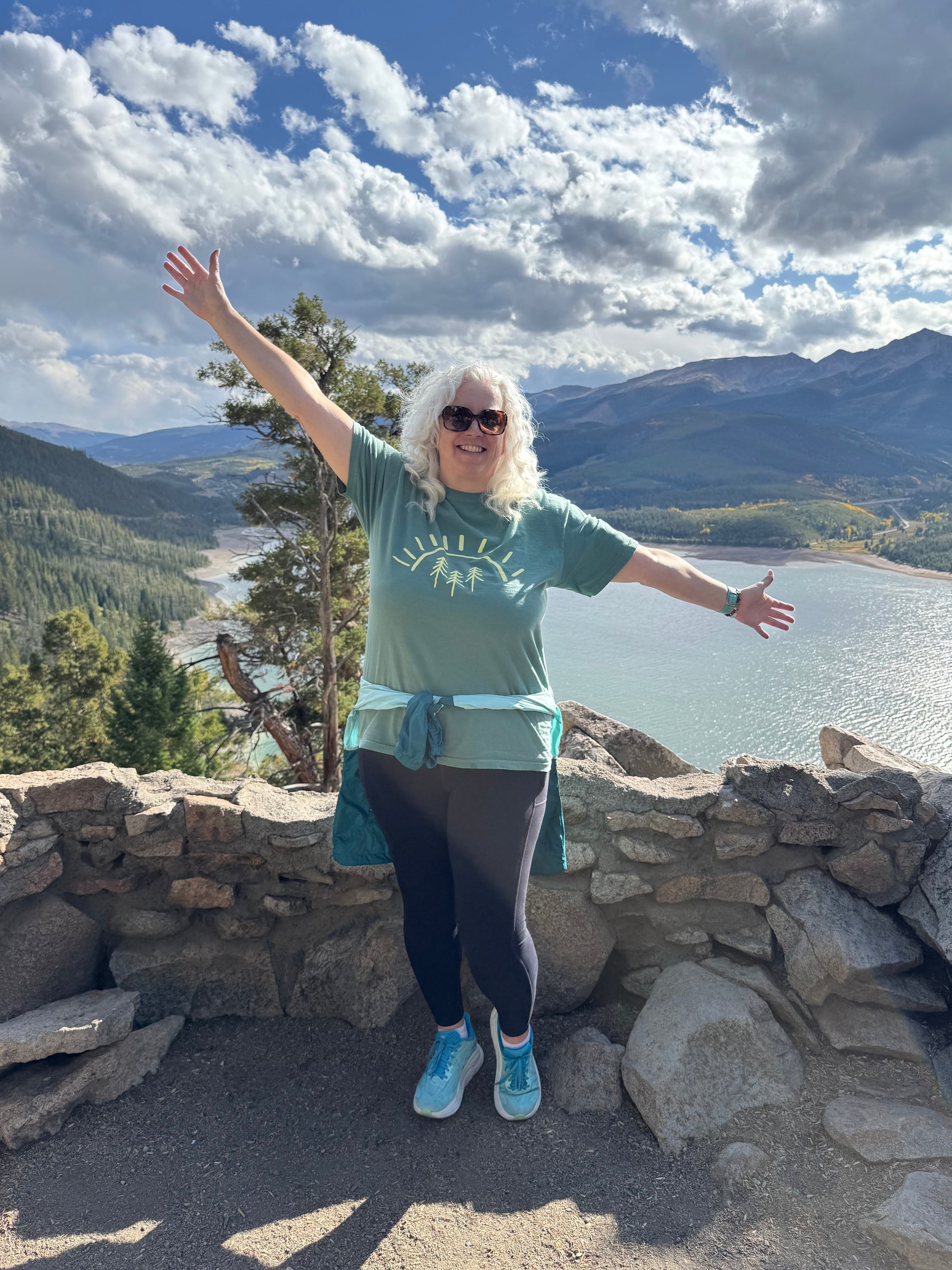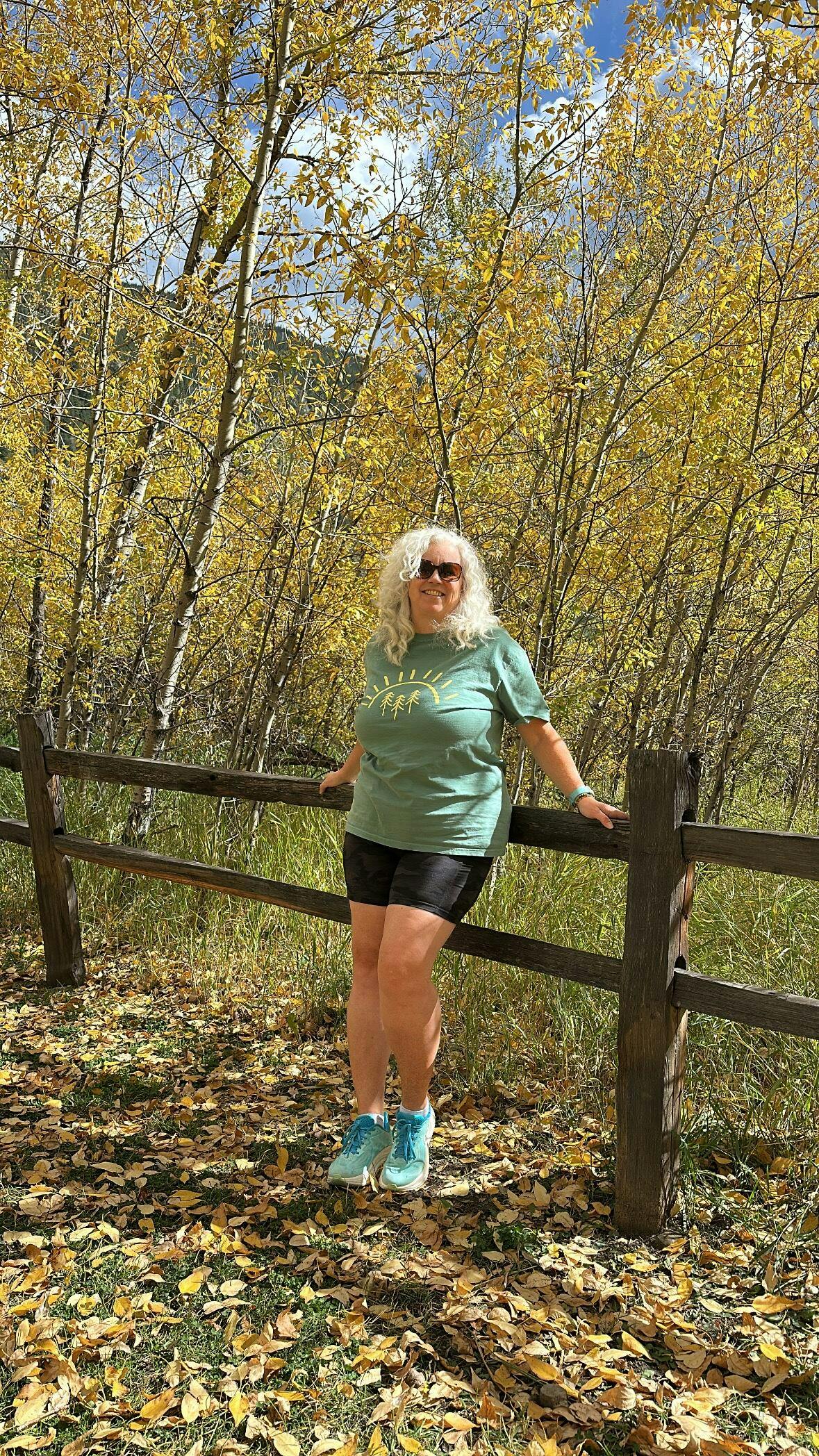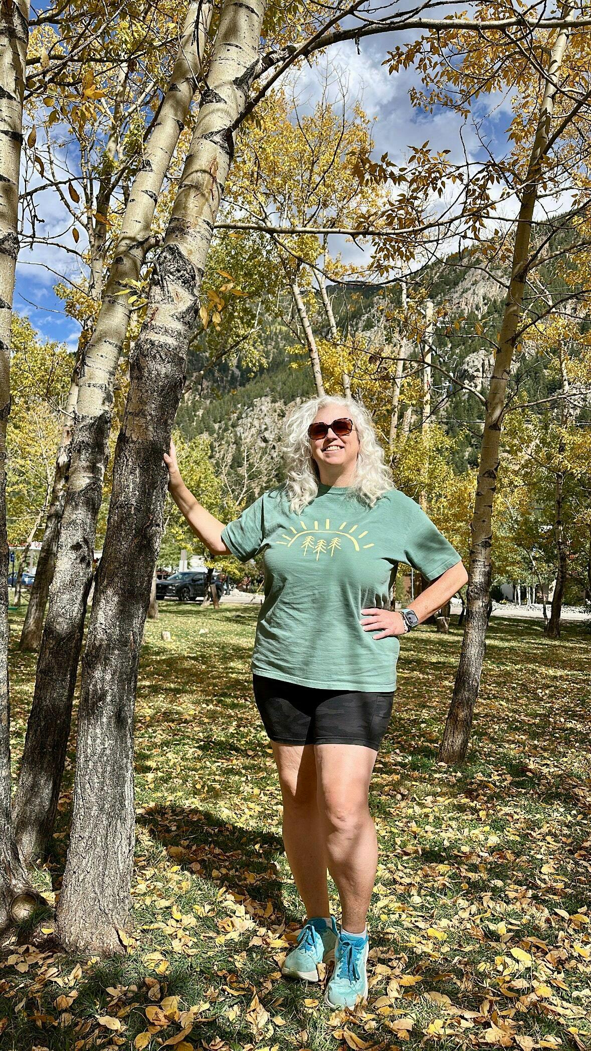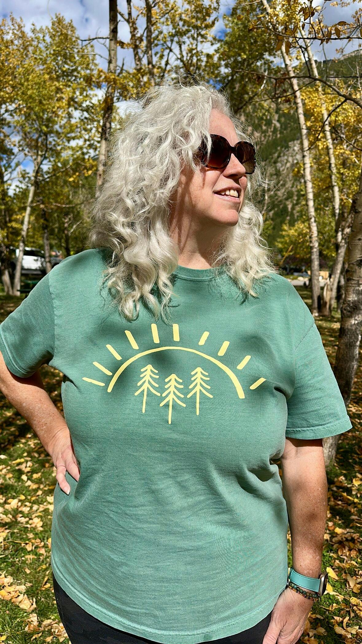 Our best selling pine tree sun design printed with yellow ink on a light green tee, distressed design some dots and lines throughout for a textured look!