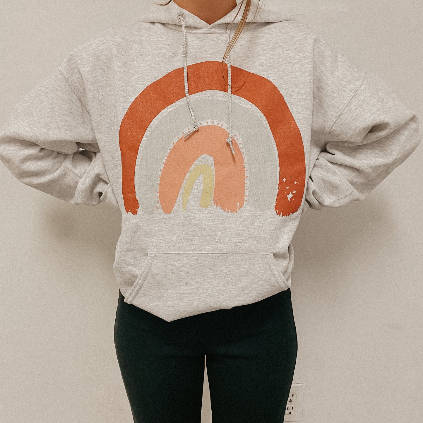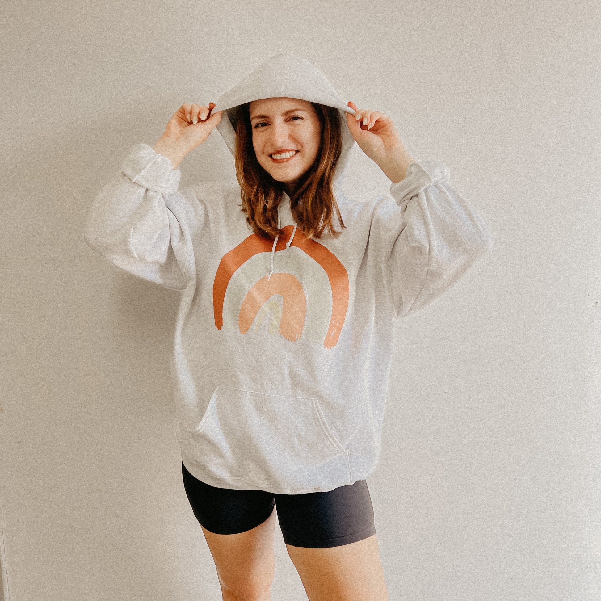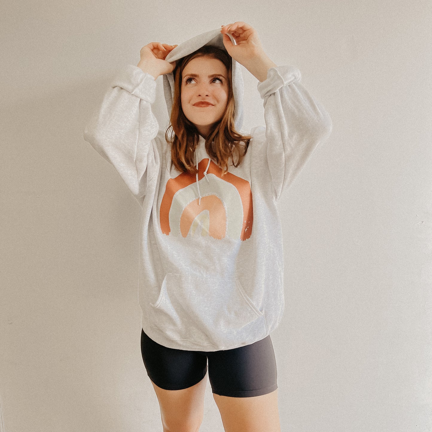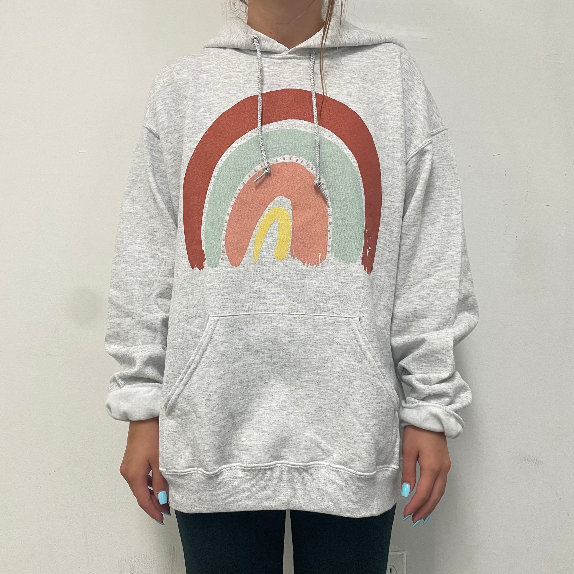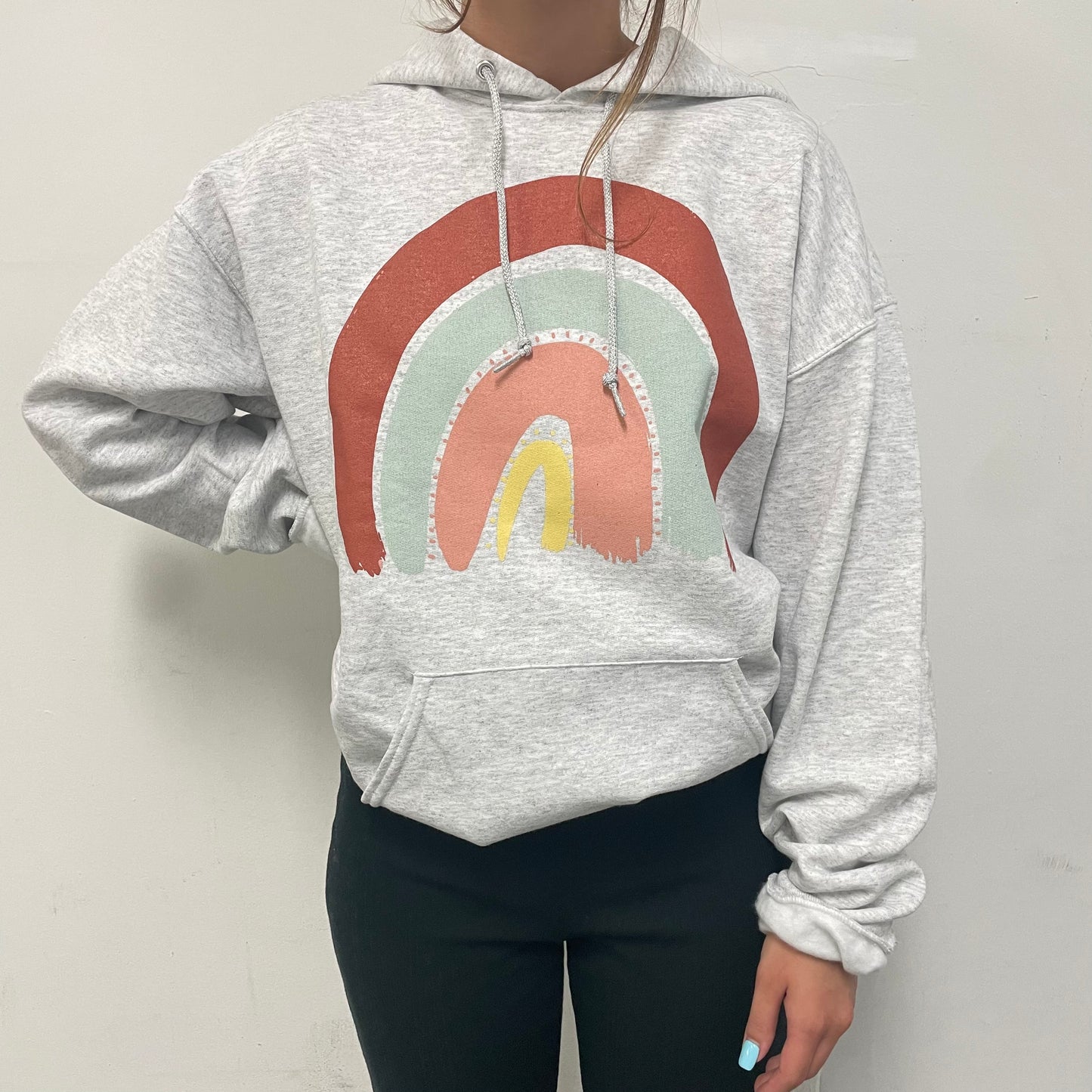 Our best selling signature rainbow design printed with 4 colors of ink on a light grey hoodie!