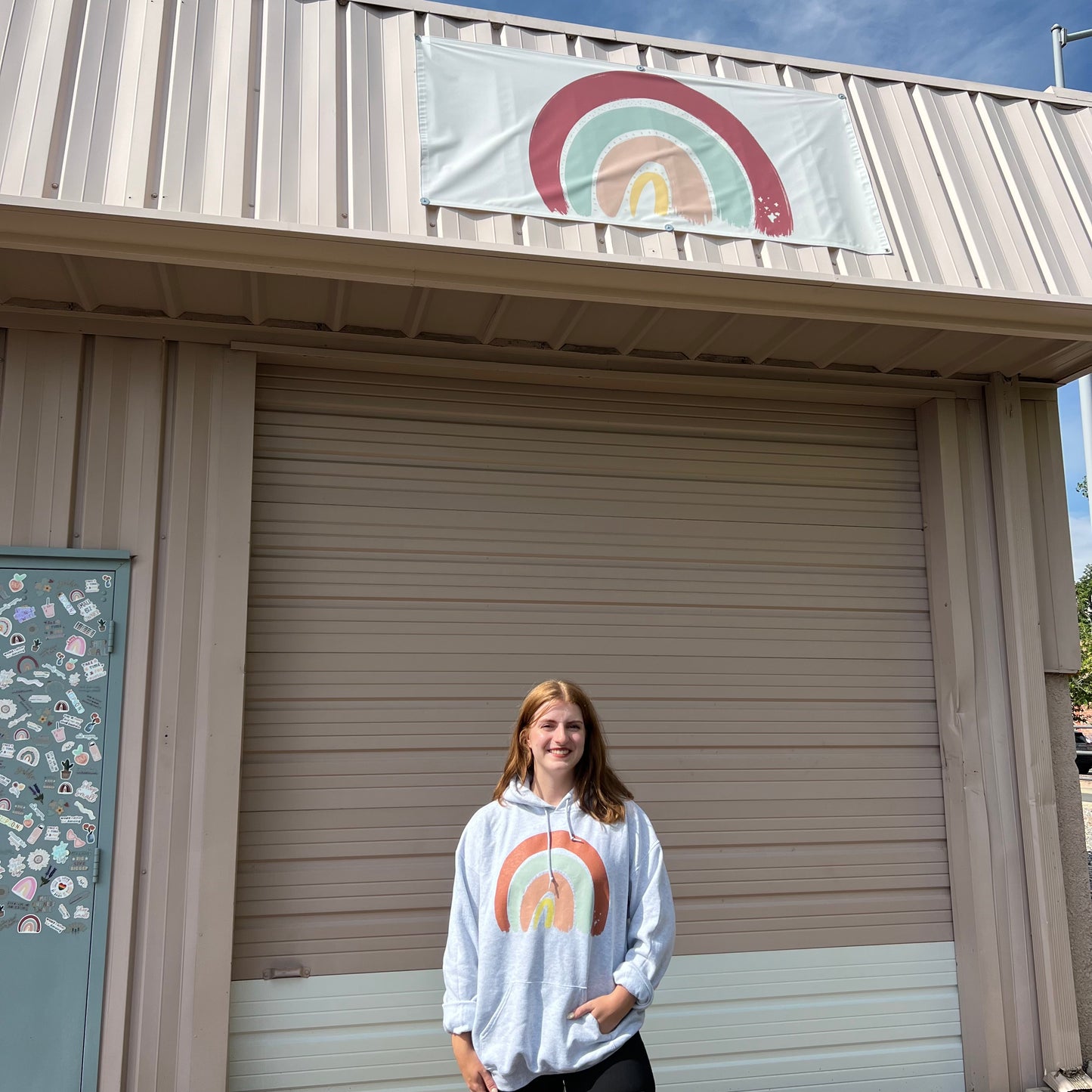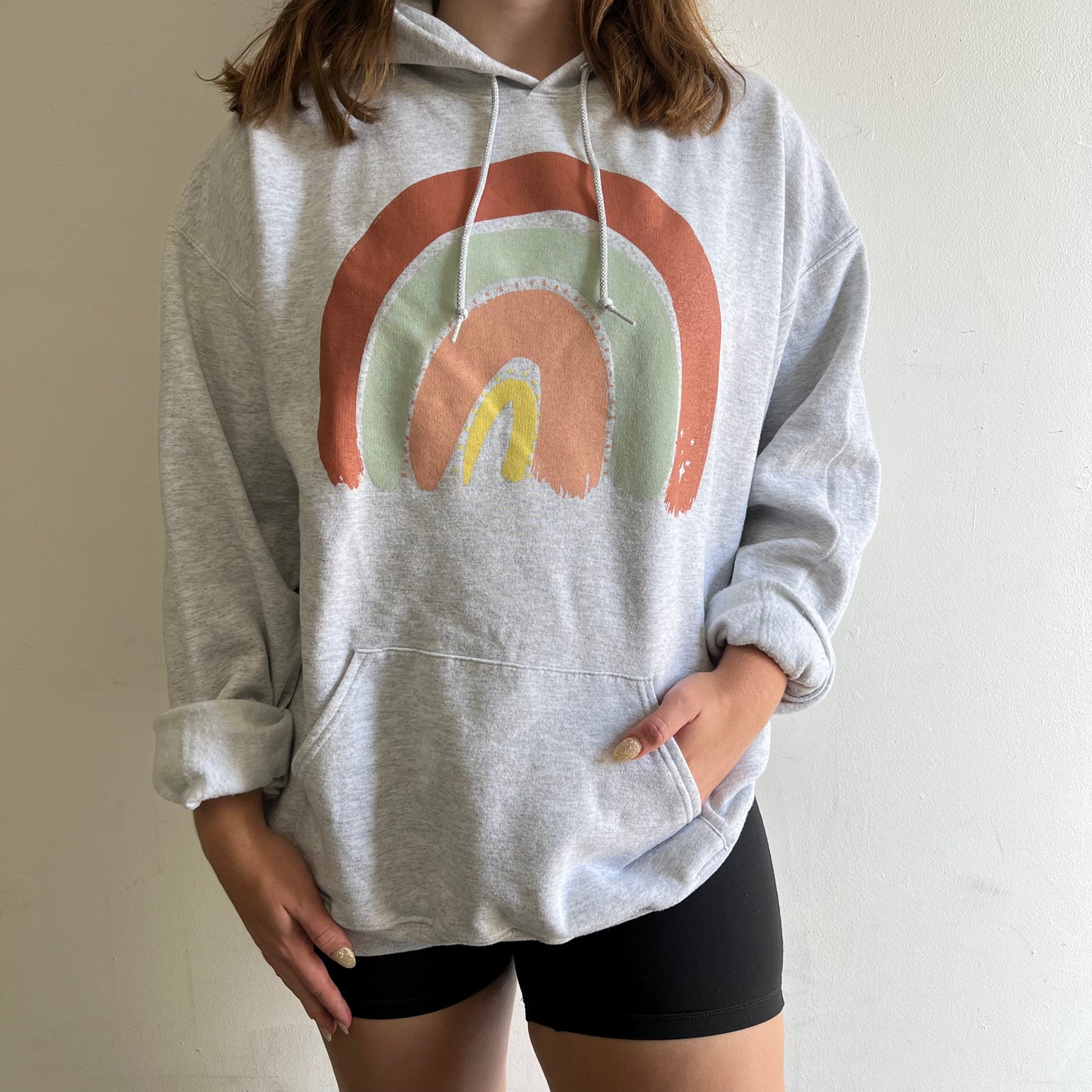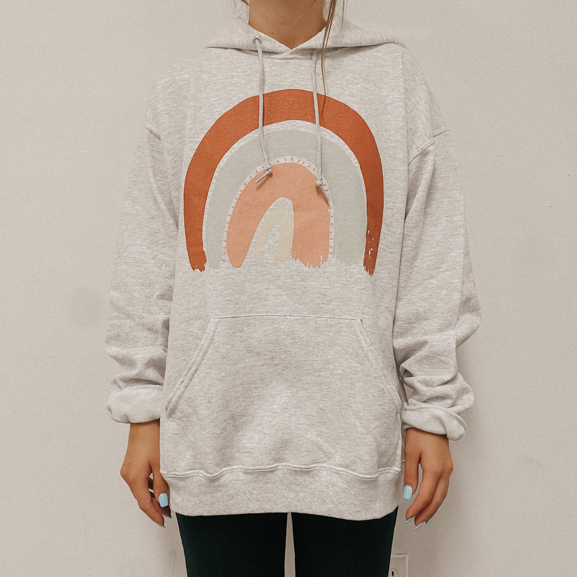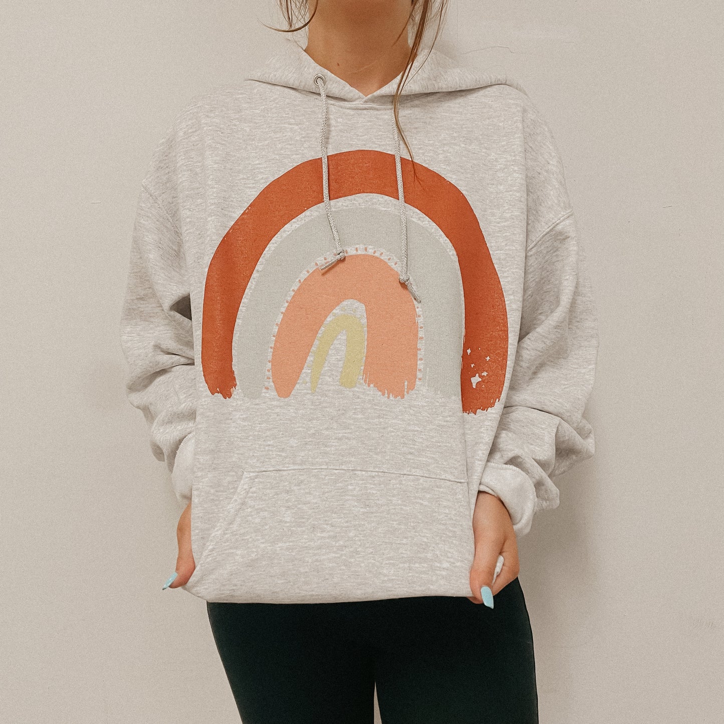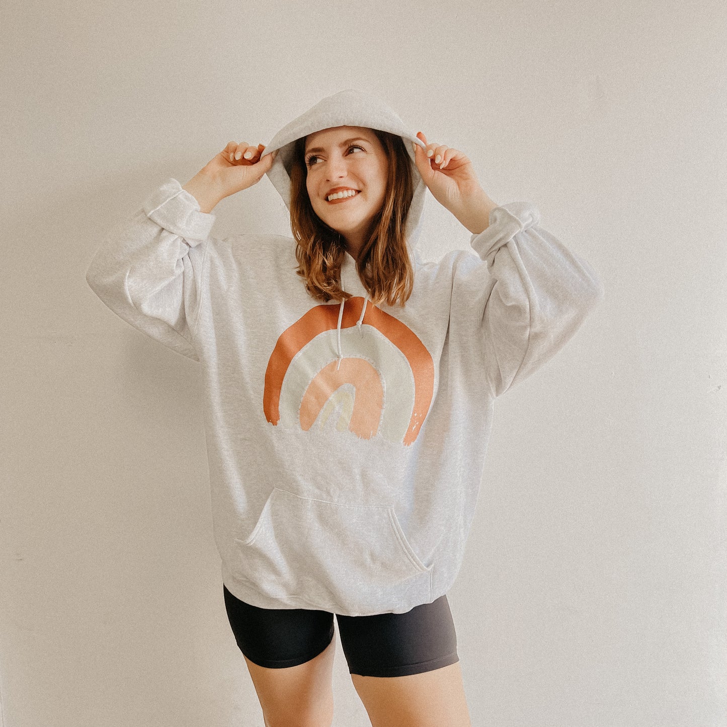 Our best selling signature rainbow design printed with 4 colors of ink on a light grey hoodie!
