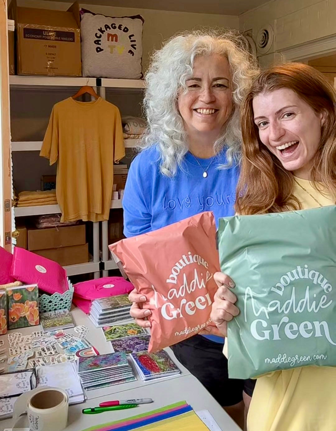 Maddie started going live in her parents basement in 2020 to package orders, draw new products, or to just connect with her following. Now over thousands watch "MGTV" Maddie Green TV on tiktok to decrease anxiety, be productive, or to just have a friend on the other side of the screen.
