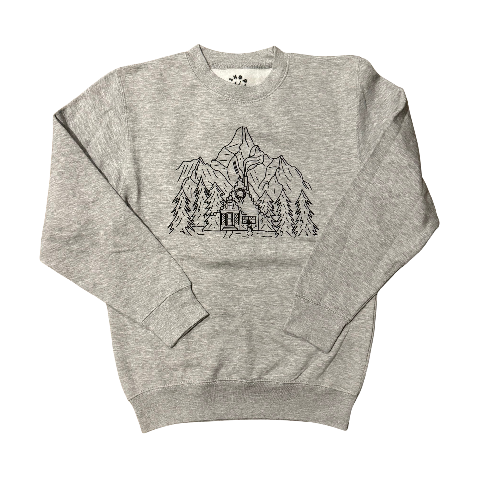 Winter Cottage is a heather grey super soft PREMIUM heavy blend crewneck sweatshirt professionally screen-printed in black ink. Slouchy unisex fit. Stay true to size for a cozy fit, size up for extra roomy, and size down for a true fitted feel.