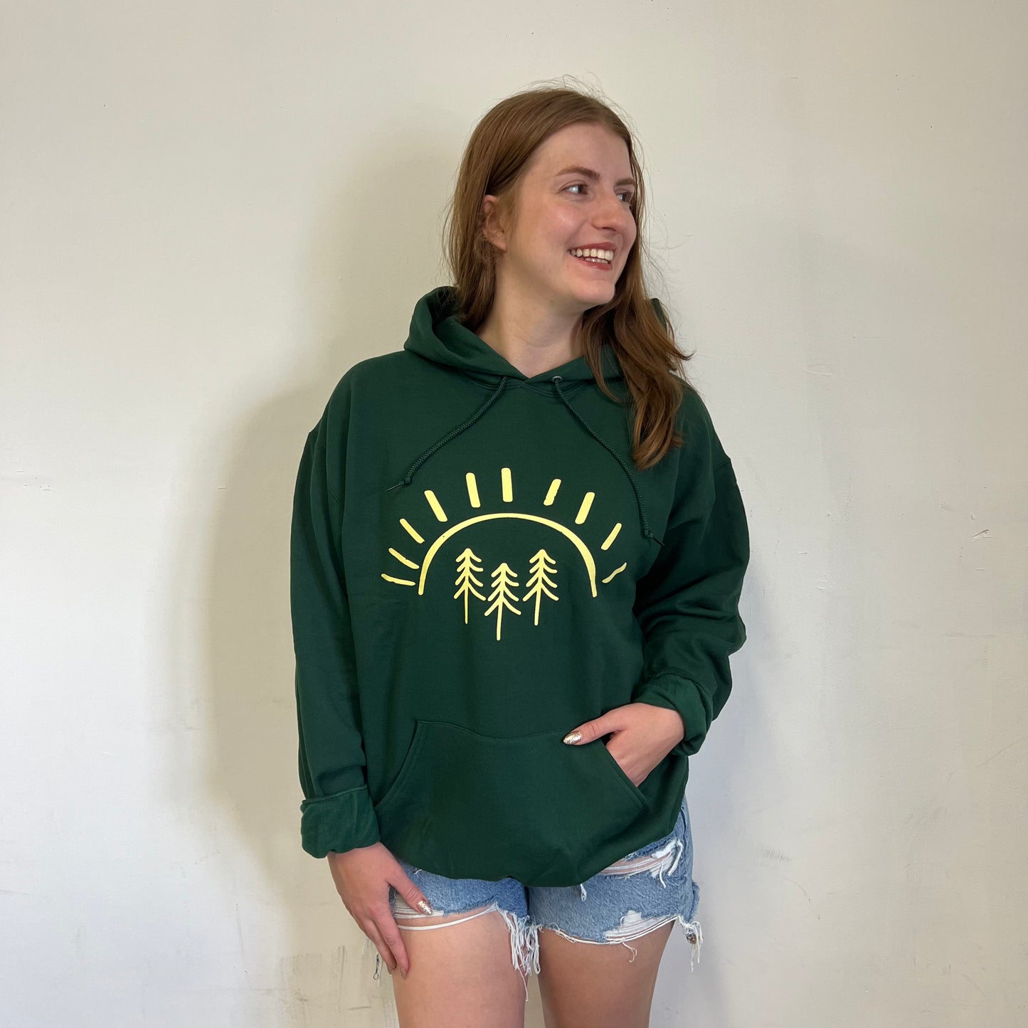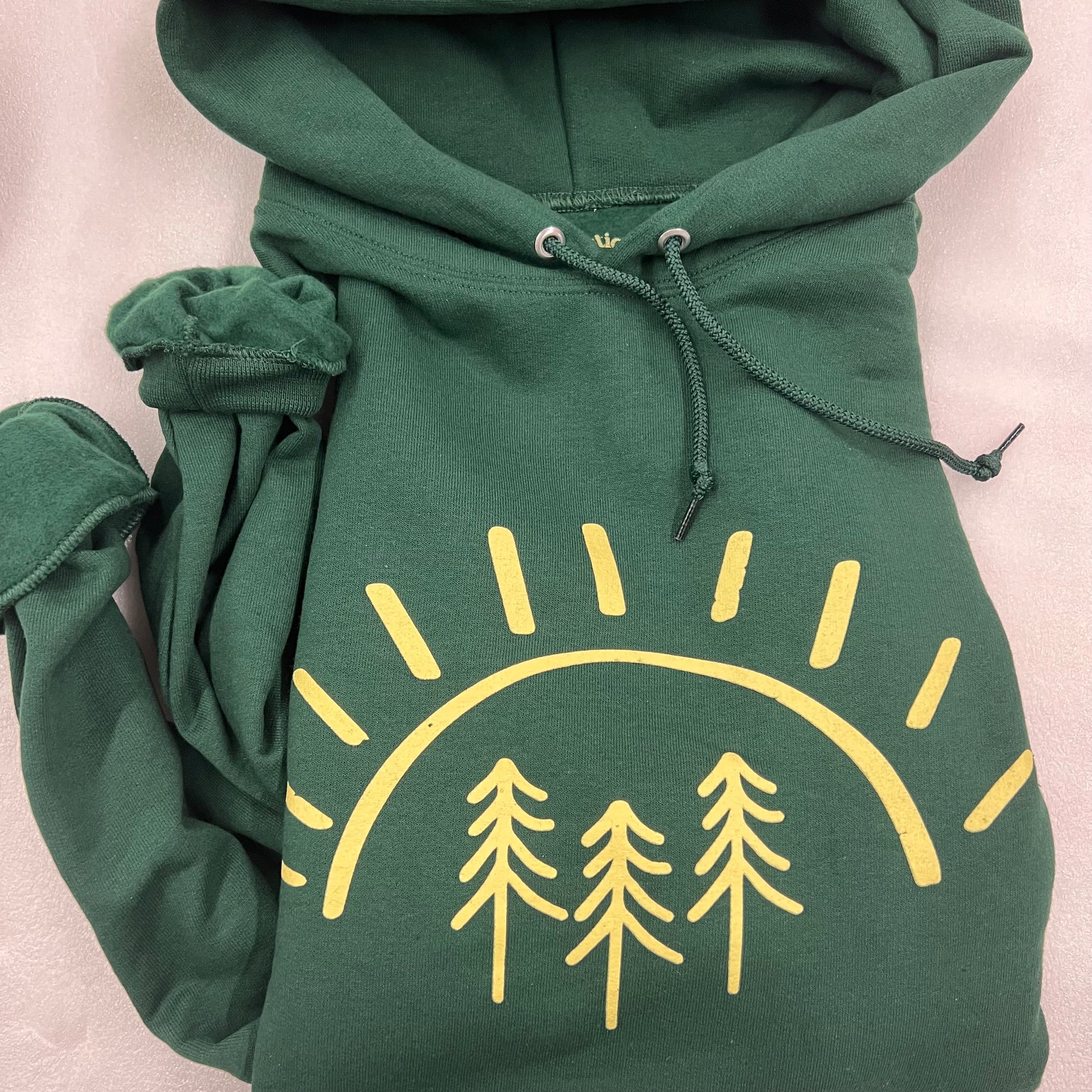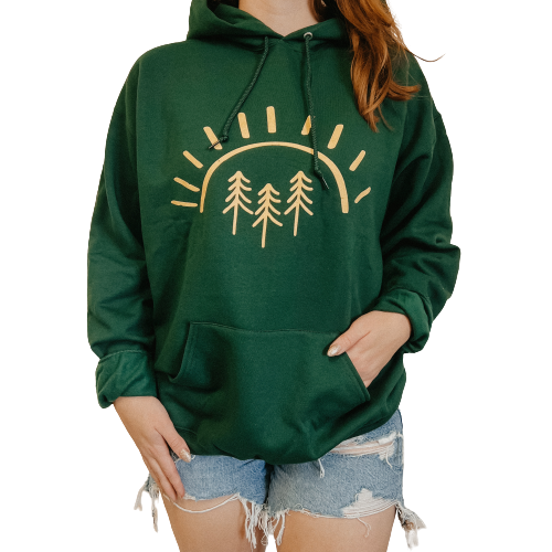 Our best selling pine tree sun design printed with yellow ink on a light green tee, distressed design some dots and lines throughout for a textured look!