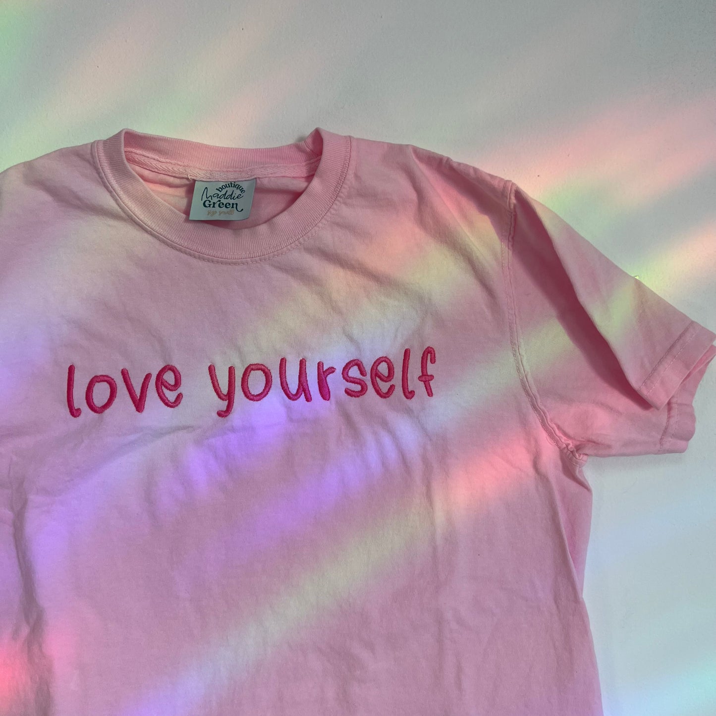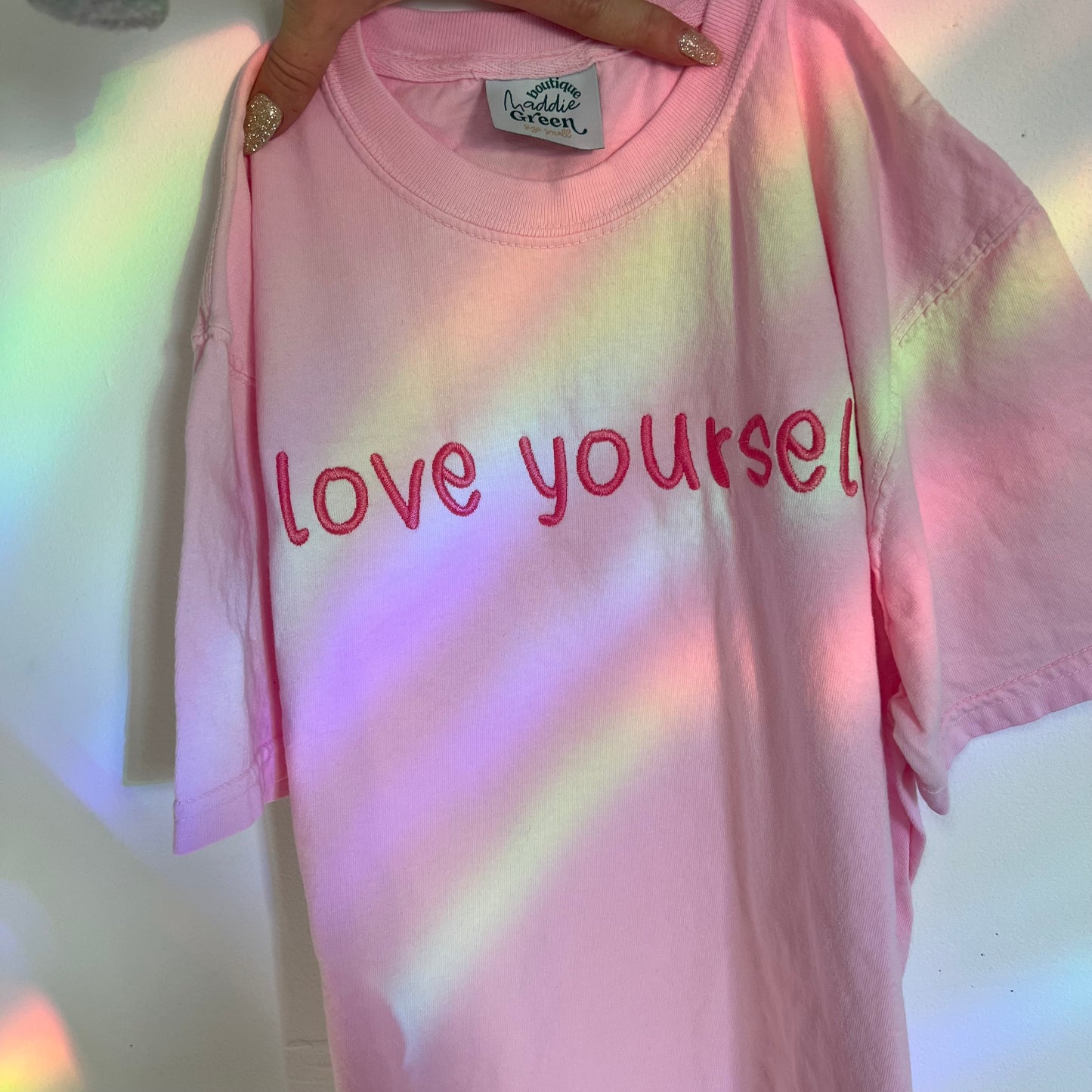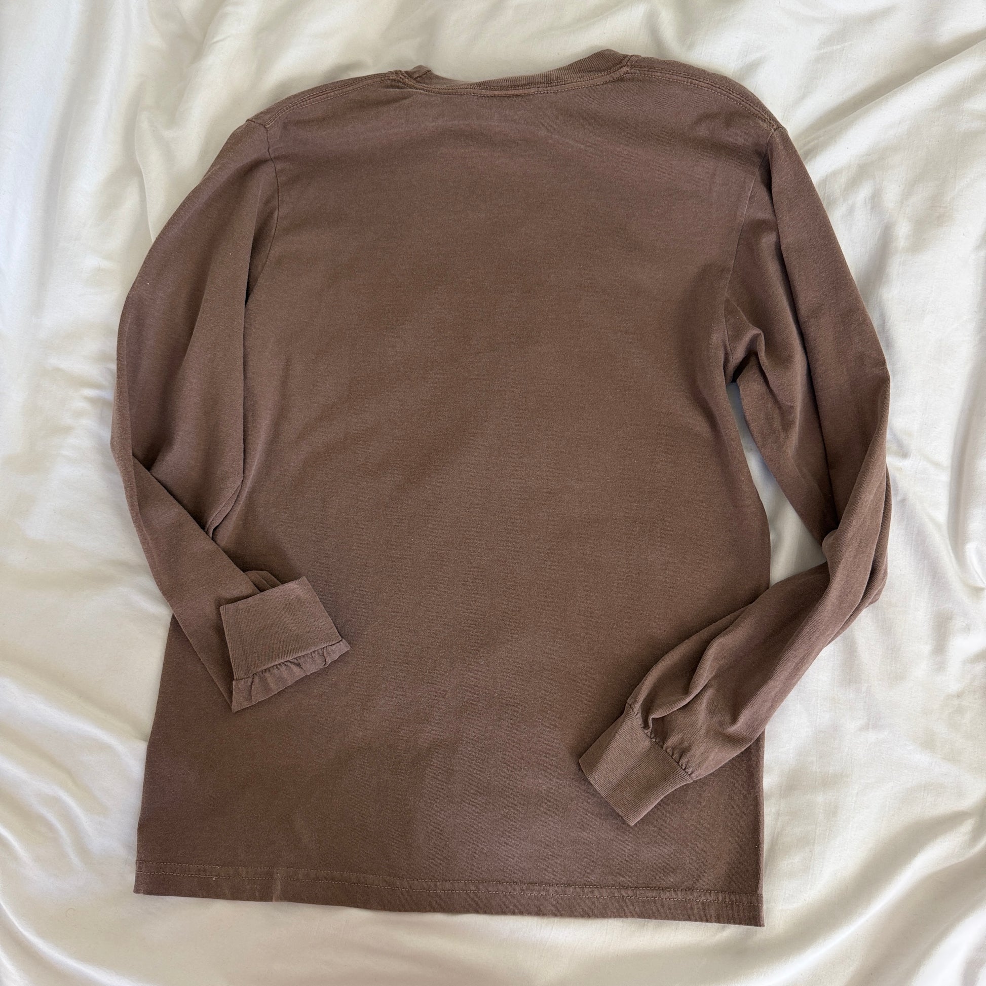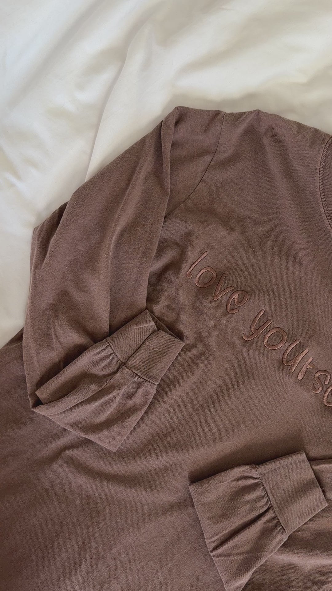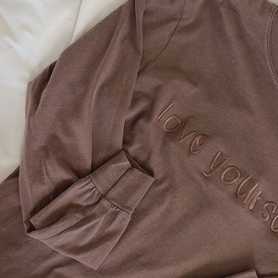 Espresso brown garment dyed long sleeve top with monochromatic embroidery thread. Nice thick embroidery stabilizer across the inside of "love yourself" for embroidery that will last a lifetime, and comfort against the skin. It is noticeable through the shirt, and gets softer overtime.