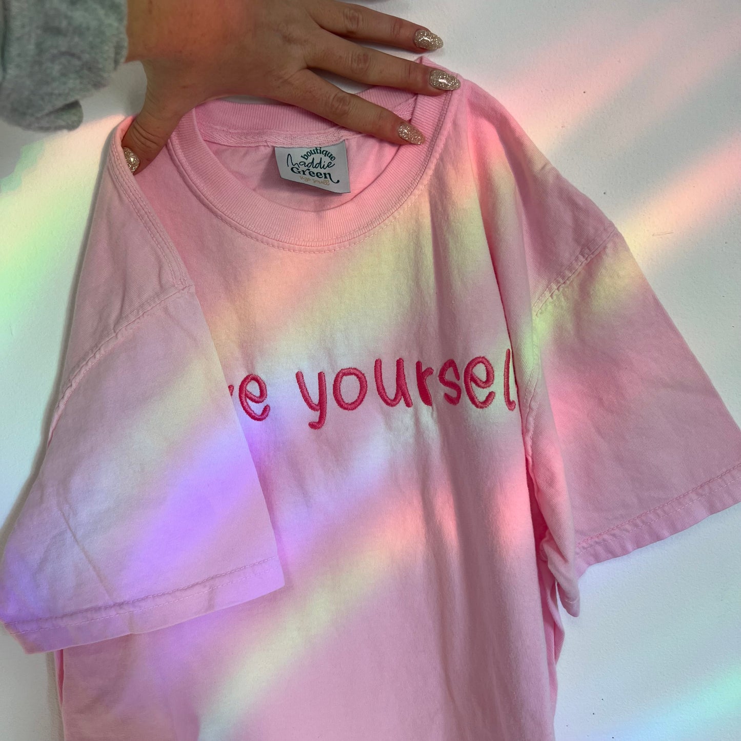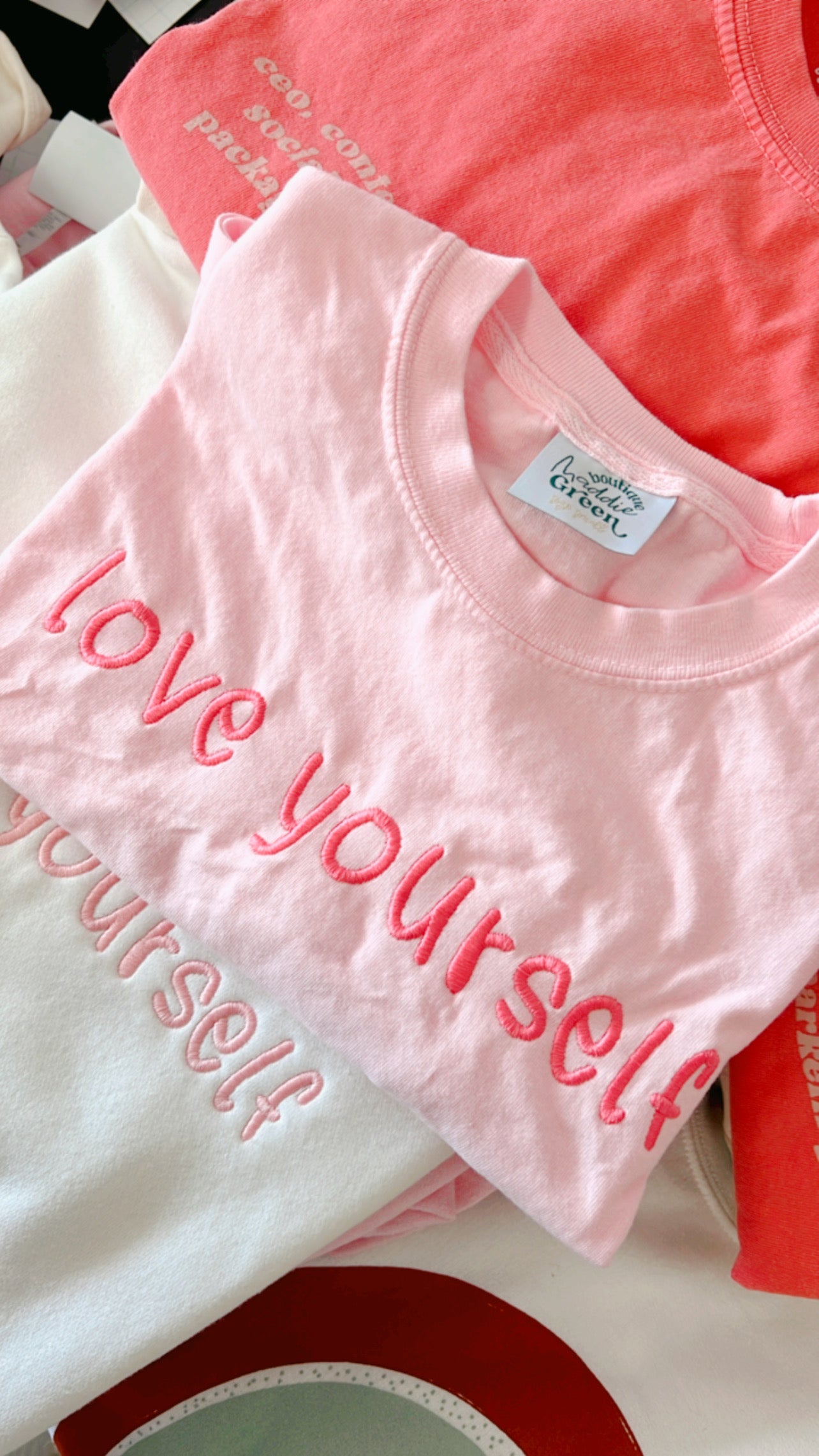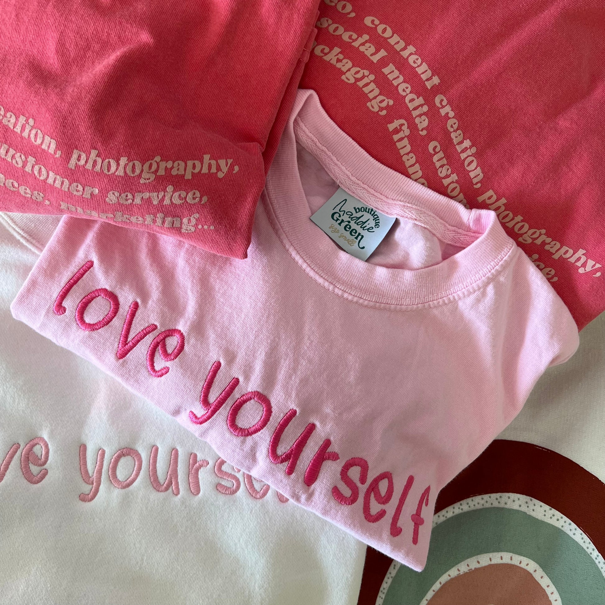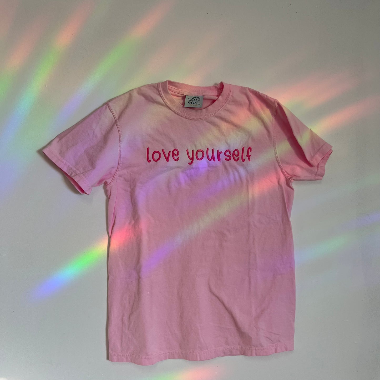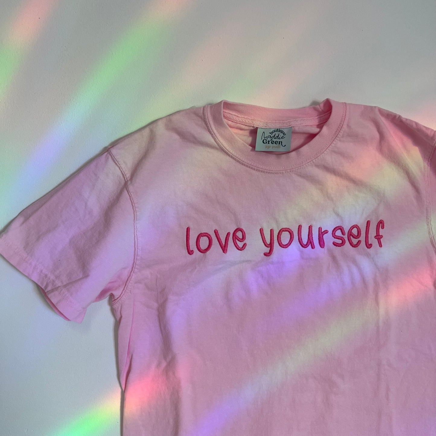 Espresso brown garment dyed long sleeve top with monochromatic embroidery thread. Nice thick embroidery stabilizer across the inside of "love yourself" for embroidery that will last a lifetime, and comfort against the skin. It is noticeable through the shirt, and gets softer overtime.